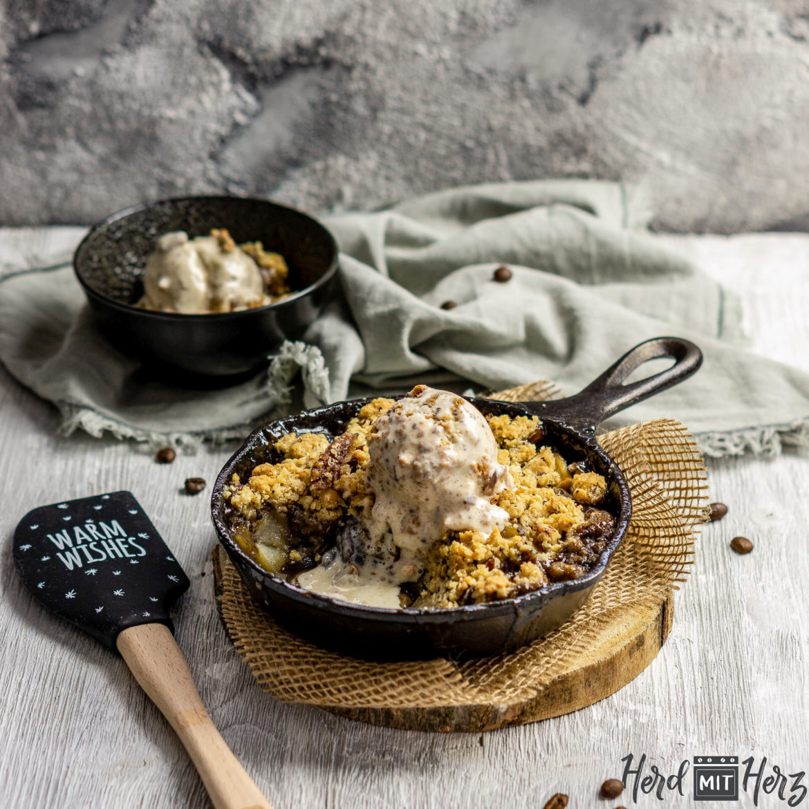 Die Kondensmilch mit der Creme Double vermengen. Die Sahne steif schlagen und dazu geben sowie die Vanillepaste und die Stärke. Die Kuvertüre klein hacken und untermischen. Die Spekulatius Kekse zerbröseln und ebenfalls hineingeben. Alles gut verrühren und in ein gefriertaugliches Gefäß geben und über Nacht gefrieren lassen. Mehl, Zimt und Zucker vermengen. Die Espresso Bohnen mit einem Mörser zerstoßen und mit der kalten Butter in Flocken dazu geben und verkneten. Im Tiefkühlfach kurz kühlen. Den Apfel und die Birne schälen, in Stücke schneiden, Butter und Honig in einer Pfanne erhitzen bis es schäumt, die Apfel- und Birnenstücke zugeben sowie die Nüsse und Datteln. Stärke mit etwas Apfelsaft vermengen und unterrühren, aufkochen lassen. Alles ein wenig abkühlen lassen. Eine Auflaufform einfetten und die Apfel-Birnen Mischung einfüllen. Den Crumble darüber verteilen und für ca. 20-25 Minuten im Ofen bei 180 Grad backen. Falls der Crumble zu dunkel wird, mit etwas Alufolie abdecken.