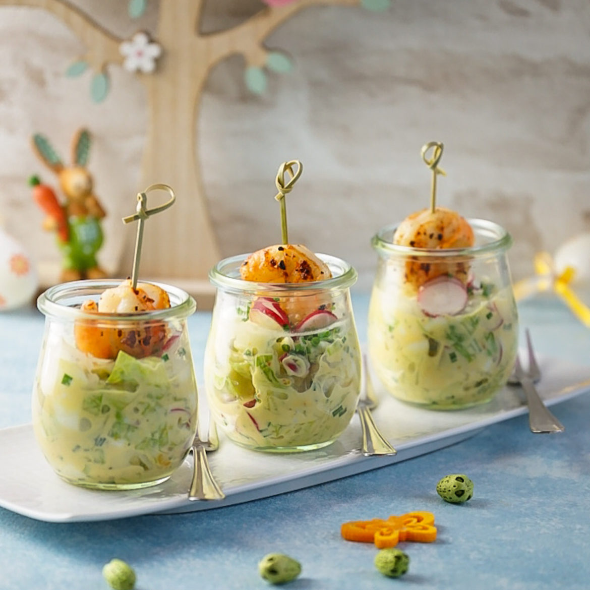 Alles mit der Sauce vermengen und in Gläser füllen. Die Tiger Prawns oben auflegen.