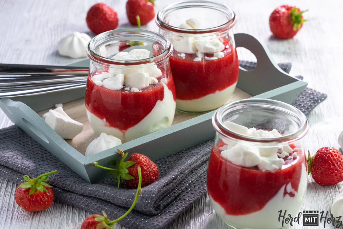 Nun schichtweise die Zutaten in die Gläser füllen, angefangen mit dem Quark, dann das Erdbeerpüree und dann die Baiserstücke darauf streuen.