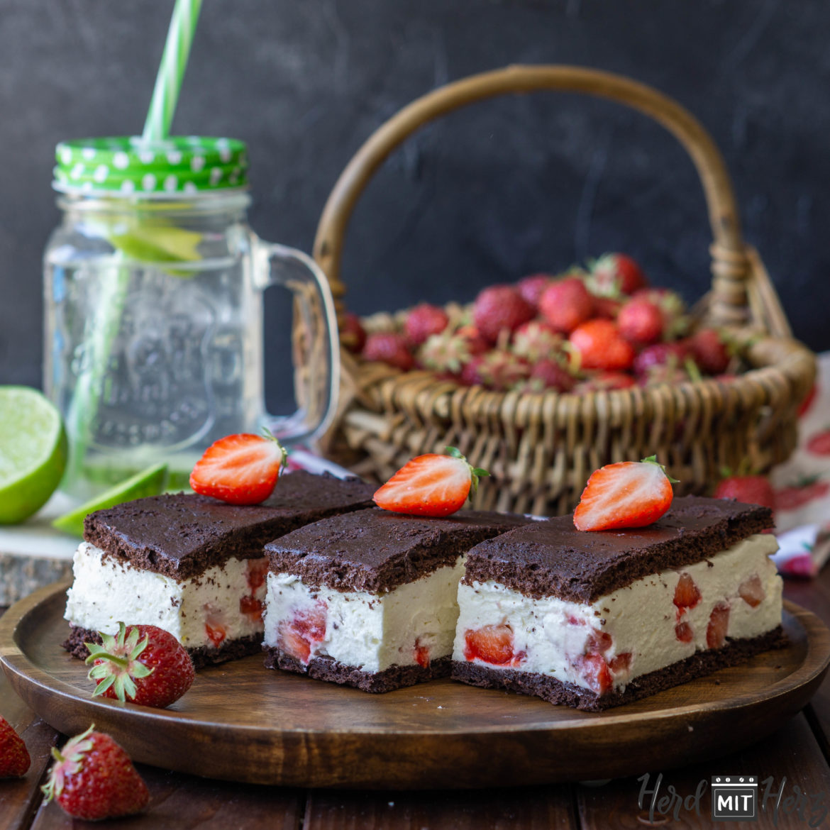Schoko Biskuit und Erdbeeren? Das geht wunderprächtig…Vor allem muss man die Erdbeeren Saison noch genießen und mitnehmen, solange es noch möglich ist. Diese kleinen Schnitten eignen sich auch für kleinere Besuchsrunden oder auch anstelle eines Kuchens einfach für den Snack für zu Hause. Ich liebe Erdbeeren, da sie so flexibel einzusetzen sind. So zum Beispiel auch in einem Cocktail verarbeitet. Schaut doch mal in mein Erdbeeren Gin Tonic Rezept rein…