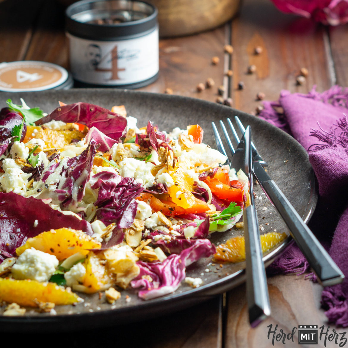 Für die Stärkung der Abwehrkräfte sorgt der Radicchio in dem Salat sowie die Blutorange, die sowohl im Dressing verwendet wurde als auch in Filet Form den Salat schmückt.