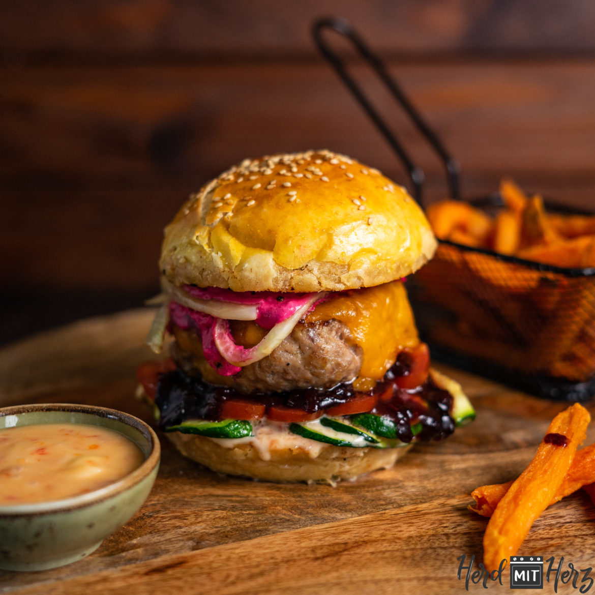 Iberico Patty Burger mit Fenchel und Zucchini gegrillt, Asia Mayo, Pflaumen Zwiebel Chutney, Frischkäse mit Rote Beete Pulver
