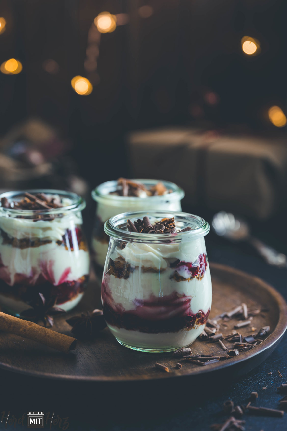 Die Kirschen aus dem Glas durch ein Sieb in einen Topf schütten, den Saft auffangen und die Kirschen zur Seite stellen. Den Saft aufkochen und Gewürz, Zimtstange, Sternanis, Kardamom und Orangen- und Zitronenschale zugeben. Nun den Saft 10 Minuten leicht köcheln lassen. Dann die Stärke mit etwas Wasser vermischt einrühren und erneut etwas einkochen lassen. Zur Seite stellen und abkühlen lassen. Die Lebkuchen in eine Küchenmaschine geben und kurz zerkleinern. Mascarpone und Quark in eine Schüssel geben und vermengen. Gewürz und Vanillepaste zugeben und zu einer homogenen Maße verrühren. Die Maße nun abwechselnd mit den Kirschen und den gebröselten Lebkuchen in ein Glas geben. Zum Schluss noch mit geraspelter Kuvertüre verzieren.