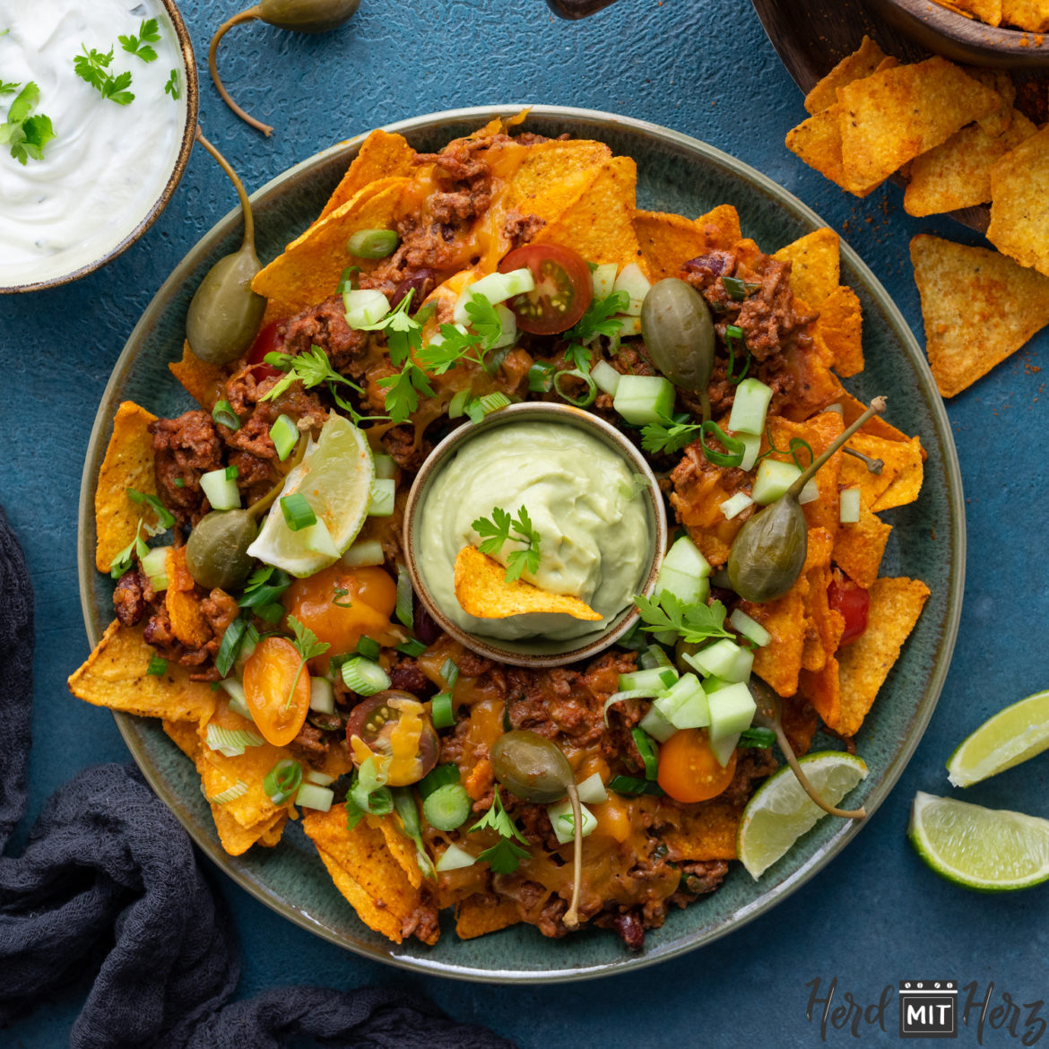 Den Backofen auf 200 Grad vorheizen. Zwiebel in Öl anbraten. Hackfleisch zufügen und gar braten. Tomatensauce oder frische Tomaten und Kidneybohnen zufügen und einköcheln lassen. Mit Paprika, Salz, Pfeffer würzen und mit Limettensaft abschmecken. Zum Schluss die Frühlingszwiebel in Ringe schneiden und hinzufügen. Eine Auflaufform einfetten und die Nachos damit füllen, das Hackfleisch Gemisch dazu geben und zum Schluss den Käse darüber verteilen. Die Form nun 5 Minuten zum Überbacken in den Ofen geben. Zur Garnierung die Kapernäpfel verteilen.