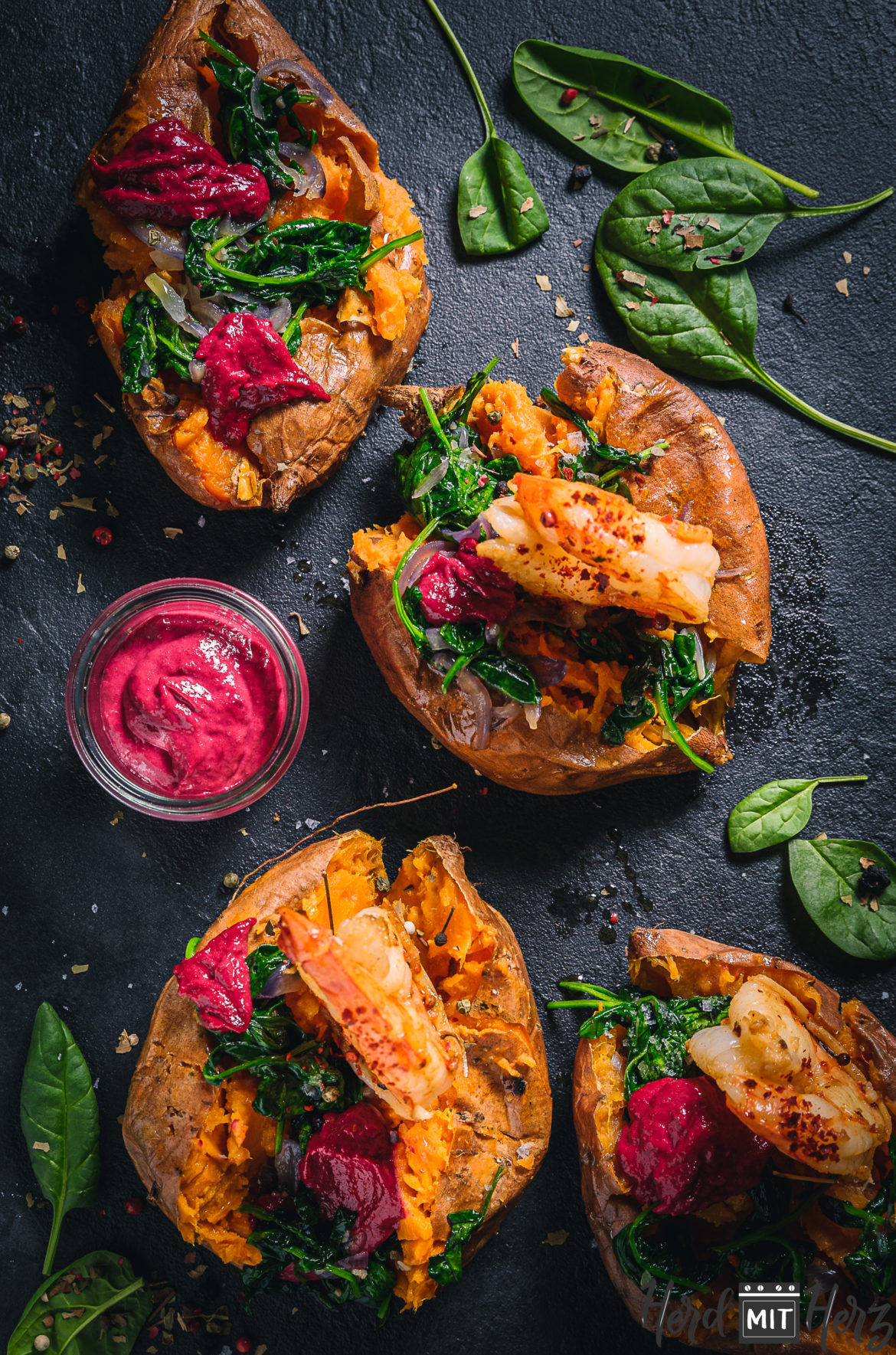 Den Backofen auf 175 Grad Ober- und Unterhitze vorheizen. Die Süßkartoffeln abbrausen, trocken tupfen und mit einer Gabel überall einstechen. Die Süßkartoffeln dann mit Öl einreiben, auf ein Backblech mit Backpapier geben und für ca. 40 Minuten in den Ofen geben. Dabei ab und an wenden. Optional: Meerrettich mit Mayonnaise und Schmand verrühren und Rote Beete Pulver unterrühren. In der Zeit die Zwiebel und den Knoblauch schälen und in einer Panne anschwitzen. Den Spinat abbrausen, trocken tupfen und dazugeben. Mit Salz, Pfeffer und Muskatnuss würzen. Die Garnelen von der Schale befreien und in einer Pfanne mit heißem Öl anbraten. Knoblauch und Chili dazu geben und mit Salz würzen. Die Süßkartoffeln in der Mitte einschneiden und mit einem Stampfer zerquetschen. Den Spinat darauf verteilen und die Garnele darauflegen. Nährwertangabe: