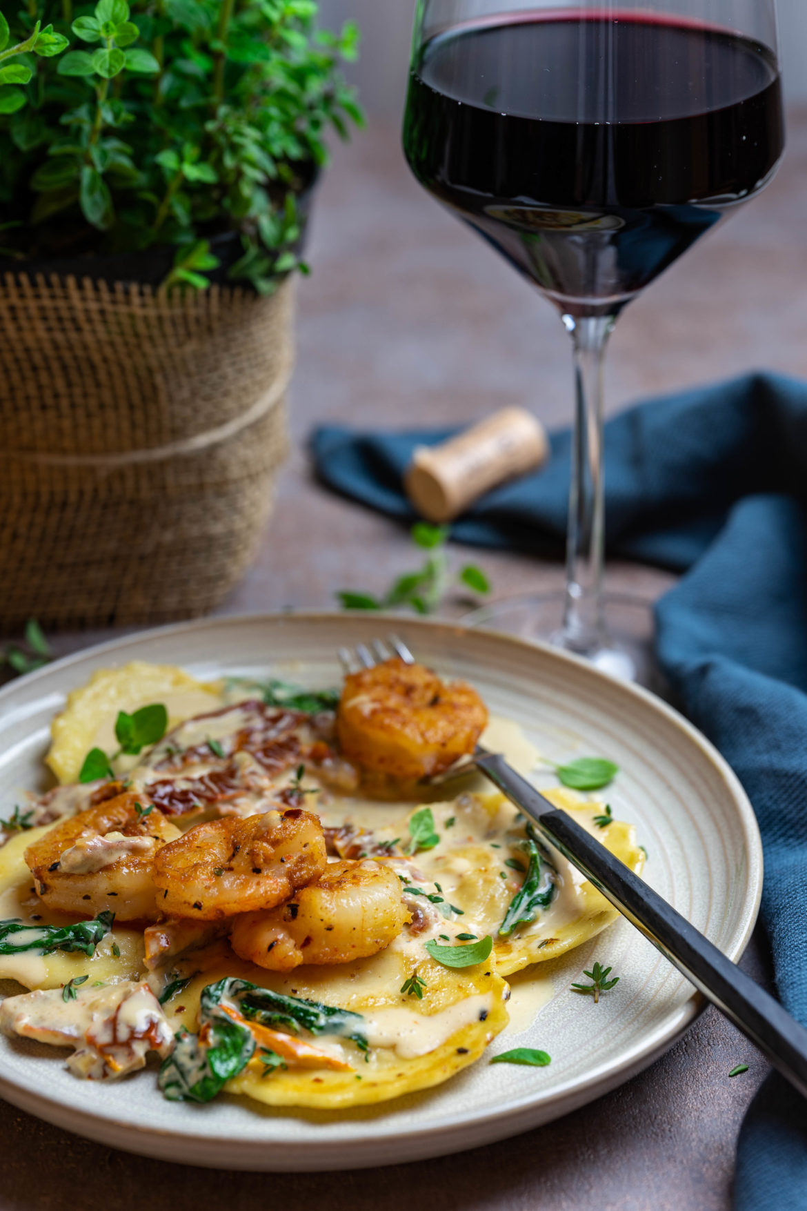 Ab und an habe ich einfach Hunger auf selbst gemachte Pasta. Wenn man es etwas plant, ist es auch kein Hexenwerk und zeitlich auch überschaubar. Nun war es bei mir mal wieder an der Zeit und ich wollte dieses Mal anstelle der sicherlich wunderbar schmeckenden und begehrten Spaghetti oder Tagliatelle, gefüllte Ravioli machen. Es gibt mittlerweile unzählige Rezepte für den Pasta Teig und unterschiedliche Varianten der Herangehensweise. Ich habe dieses Mal unserer Küchenmaschine den ersten Schritt überlassen, letztendlich muss man aber noch einmal händisch kneten, um den Teig schön elastisch werden zu lassen. Klar, das Bedarf etwas Köpereinsatz aber das gehört auch einfach dazu. Denn für ein zufriedenstellendes Ergebnis, ist es enorm wichtig, dass der Teig ordentlich geknetet wird. Und das nicht nur 2-3 Mal hin und her, sondern wirklich einige Minuten lang (bis zu 10 Minuten).Der Teig muss am Ende richtig geschmeidig sein und darf nicht mehr an den Händen kleben (dann fehlt Mehl) oder auch nicht bröseln (dann noch Öl oder Wasser zufügen).