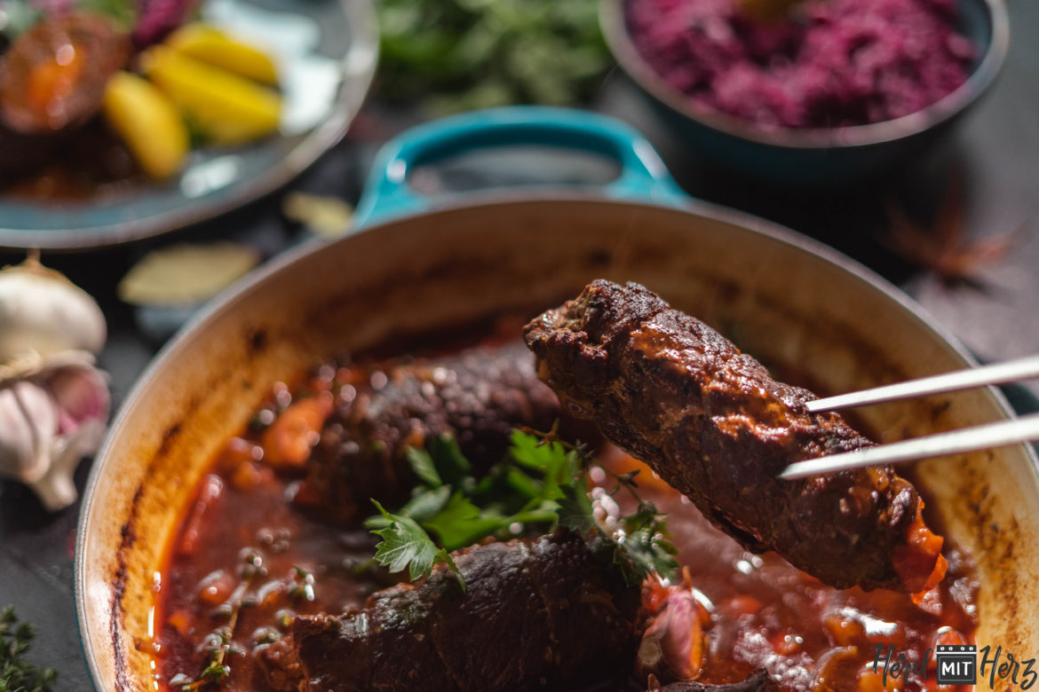 Weihnachten rückt immer näher und die Vorkehrungen und Planungen sind in vollem Gange. Ob Gänsebraten, Fisch, Rinderbraten oder Kartoffelsalat, zum Weihnachtsessen will ein jeder ein unvergessliches Fest feiern. Als Anregung habe ich ein tolles Rezept für Rinderrouladen mit Rotkohl und Salzkartoffeln für euch. Die Bratensauce der Rinderrouladen kommt ohne Rotwein aus, sodass auch alle am Tisch, ob Groß oder Klein, davon essen können. Im nächsten Post werde ich auch ein passendes Dessert dazu verraten. Seid gespannt…Ich hatte schon mal probieren dürfen und freue mich auf Heiligabend, wenn wir das Dessert offiziell genießen dürfen 😉