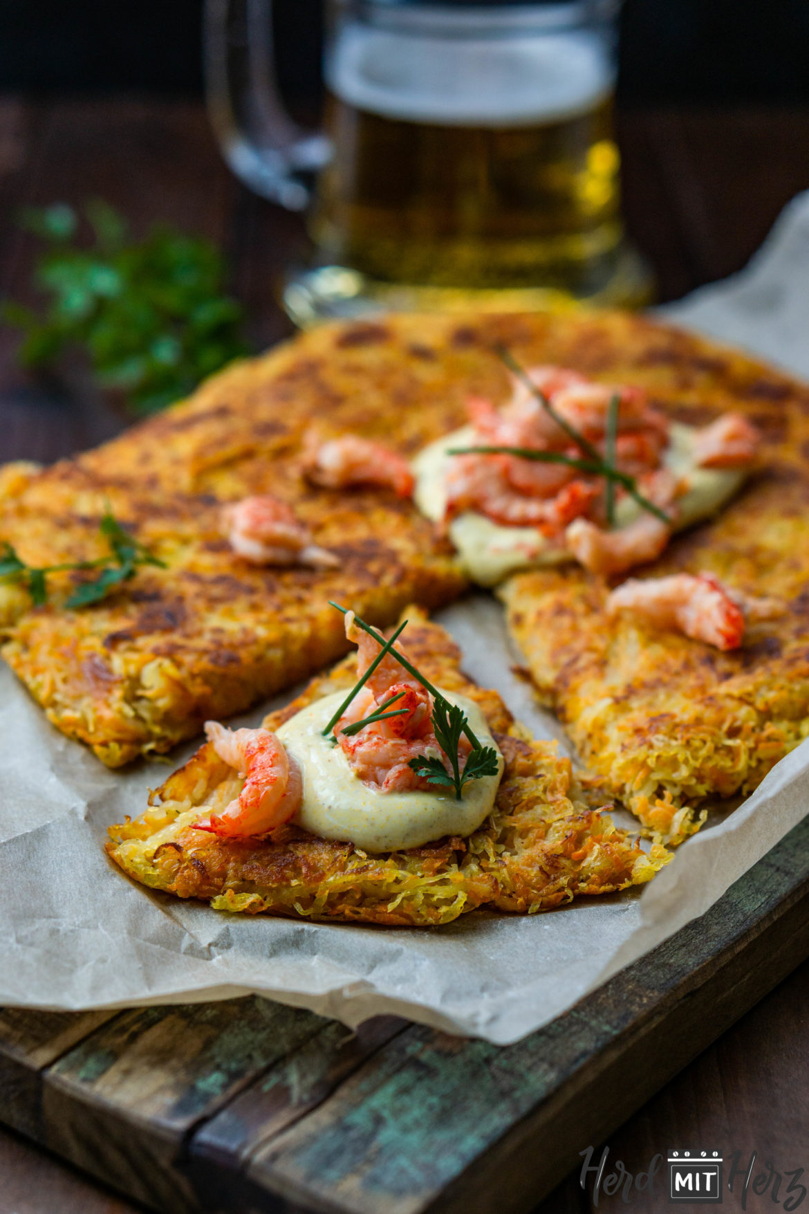 Rösti aus Kartoffel und Süsskartoffel mit Curry Dip und Flusskrebsen