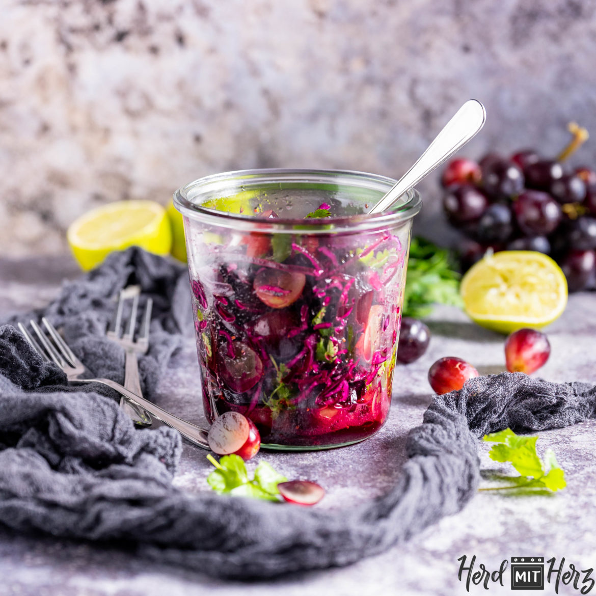 Den Rotkohl in dünne Streifen schneiden und mit etwas Salz kurz ziehen lassen. Die Weintrauben abbrausen und halbieren. Den Koriander waschen und trocken tupfen. Ein Dressing zubereiten aus den o.g. Zutaten und mit dem Rotkohl vermischen. Nach Bedarf noch nachsalzen, Pfeffer, Ingwer und Limettensaft zugeben und erneut abschmecken. Die Trauben vorsichtig unterheben und alles in Gläser füllen. 423kcal 30,0g Kohlenhydrate 3,7g Eiweiß 30,6g Fett