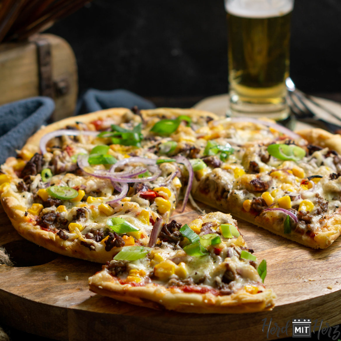 Für den Teig den Quark mit Öl, Eigelb, Milch und Salz mischen. Das Mehl mit dem Backpulver vermengen und zum Quark Öl Gemisch geben und alles mit einer Küchenmaschine 5 Minuten kneten. Den Teig dann am besten im Kühlschrank kurz ruhen lassen. In der Zeit das Hackfleisch anbraten und etwas abkühlen lassen. Die Zwiebel schälen und in feine Streifen schneiden. Pizzatomaten zerkleinern, mit Salz, Pfeffer, Oregano, BBQ Sauce und 1 EL Olivenöl mischen. Den Teig ausrollen und die Sauce darauf verteilen. Das Hackfleisch darauf geben sowie die Zwiebeln und das Mais Gemisch und den Käse. Die Pizza dann für ca. 15 Minuten in den vorgeheizten Ofen (bei 200 Grad) geben. Abschließend die Frühlingszwiebeln darauf verteilen.