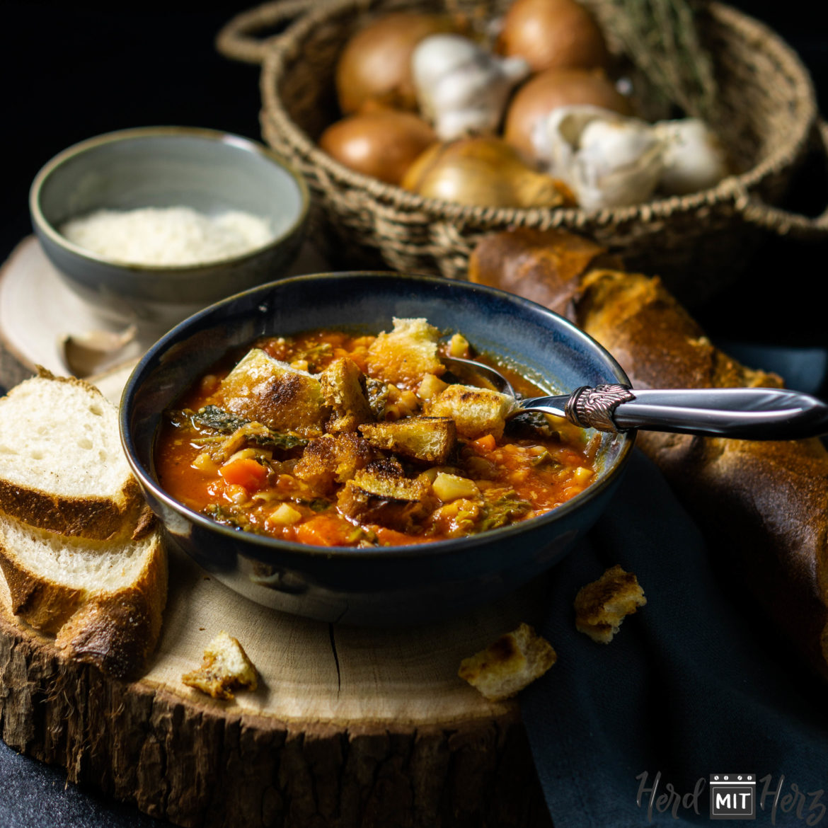 Der pikante Eintopf sorgt auch ohne winterliche Temperaturen beim Essen für ein Stück Seelenglück. Die vegetarische Variante schmeckt herzhaft, frisch und pikant. Ursprünglich ist die Minestrone ein würziger, italienischer Eintopf. Im Winter lässt sie sich hervorragend mit den regionalen und saisonalen Gemüsesorten zubereiten. Neben den klassischen Zutaten wie Möhren und Sellerie, habe ich noch Wirsing zugefügt. Zudem habe ich noch bohnen zugefügt. Ein bisschen Soul Food muss schließlich sein. Für den Crunch sorgen die kross gebratenen Baguette Stücke, die ich in Knoblauchöl rösten ließ.