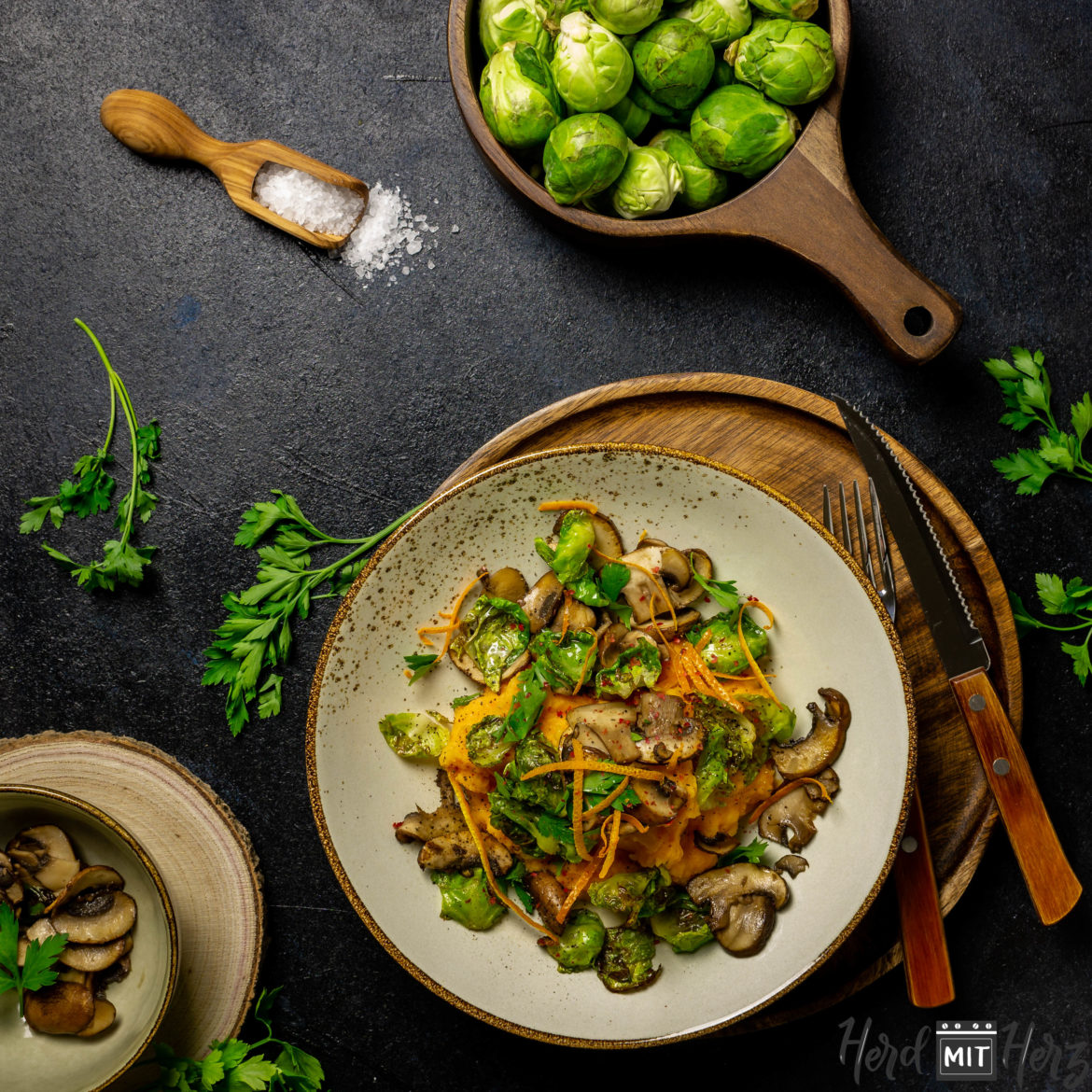 Heute gab es ein Orangen Süßkartoffel Püree mit den Resten der Champignons und Rosenkohlblätter. Die Kombination ist erstaunlich lecker und harmonisch. Die Süße des Pürees und die leicht bittere und nussige Note der Rosenkohlblätter, passen toll zusammen.