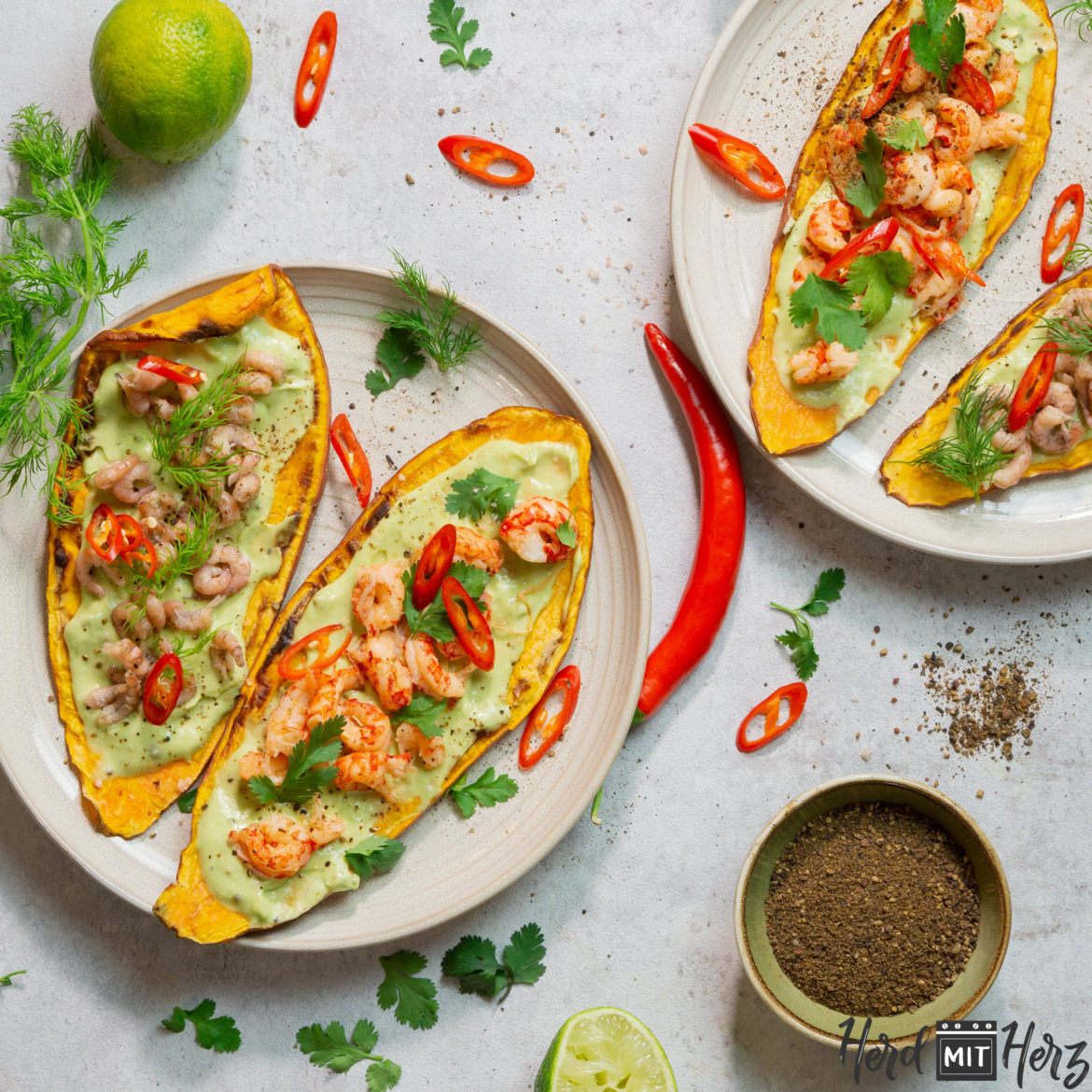 Die Süßkartoffel mit einer Gemüsebürste unter kaltem Wasser säubern. Abtrocknen und in schmale, dünne Scheiben schneiden. Diese dann dünn mit Olivenöl bepinseln und 2-3-mal in den Toaster geben (dabei ab und an mal wenden und drehen). Die Avocado in der Mitte einschneiden und drehen, sodass sich die Hälften trennen. Den Kern mit Hilfe eines Messers entnehmen. Das Innere nun in ein Mixbecher geben und Crème Fraîche, Limettensaft und die Gewürze hinzu geben. Einmal kräftig mixen und abschmecken. Die Süßkartoffelscheiben etwas auskühlen lassen und dann belegen. Zuerst die Avocado Creme, dann die Krabben bzw. Flusskrebse und dann Kräuter und Chili.