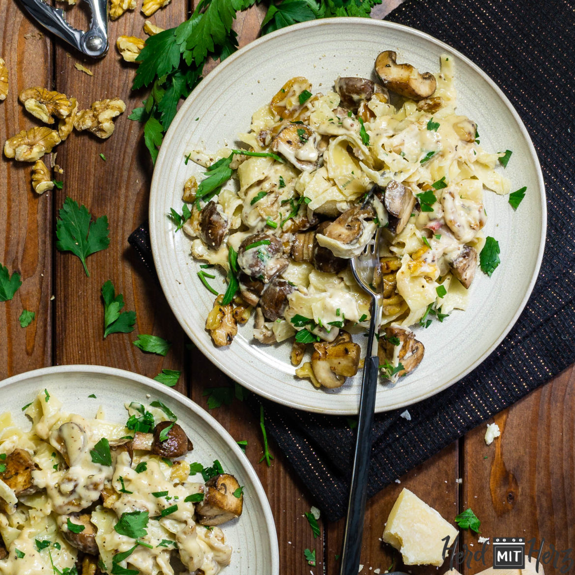 Der Herbst hat endlich offiziell Einzug genommen. Passend dazu gibt es ein herbstliches Nudelgericht. Die Walnüsse und die Pilze geben einen angenehm erdigen und herzhaften Geschmack an die Sauce ab. Das Gericht kann somit wunderbar in der vegetarischen Variante bestehen bleiben, sodass problemlos auf Fleisch verzichtet werden kann.