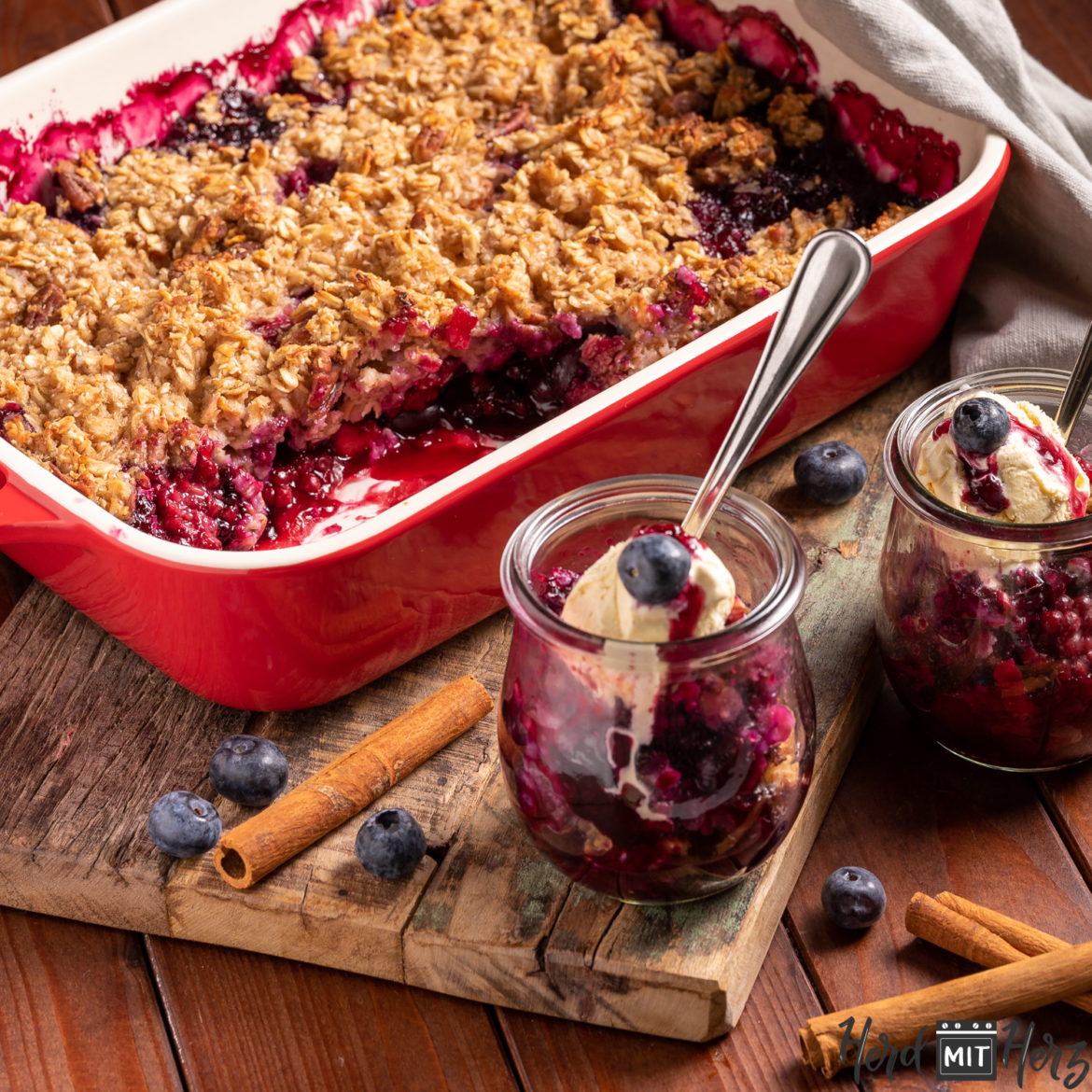 Veganer Heidelbeeren Brombeeren Crumble Vegetarisch/Vegan crumble, mandeldrink, haferflocken, beeren, brombeeren, heidelbeeren, pekanüsse European Druck mich