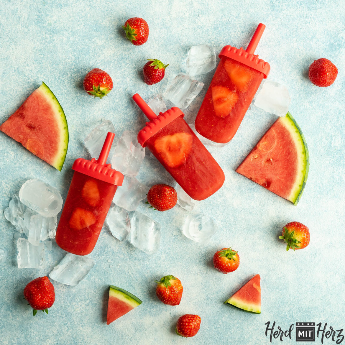 Die Erbeeren abbrausen und das Grüne abtrennen und halbieren. Die Wassermelone von der Schale trennen in Stücke schneiden. Die Wassermelonen-Stücke dann pürieren und den Saft durch ein Sieb passieren. Die Erdbeeren pürieren und mit dem Saft der Wassermelone mischen. Die Wassermelone hat einen dominanteren Geschmack als die Erdbeeren, daher nach und nach zugeben und abschmecken. Nun den Agavendicksaft zugeben und erneut abschmecken. Es kann ruhig etwas süßer sein, da durch die Kälte später ein Teil der Süße verloren geht. Die Deko Erdbeeren nun in dünne Scheiben schneiden und an die Innenseite der Popsicle Form legen. Nun die pürierten Früchte vorsichtig in die Form gießen und diese dann mit Stil für ca. 4 Stunden in den Frost geben. Am Besten ihr benutzt einen Bodenhalter für die Formen, damit diese gerade stehen bleiben.