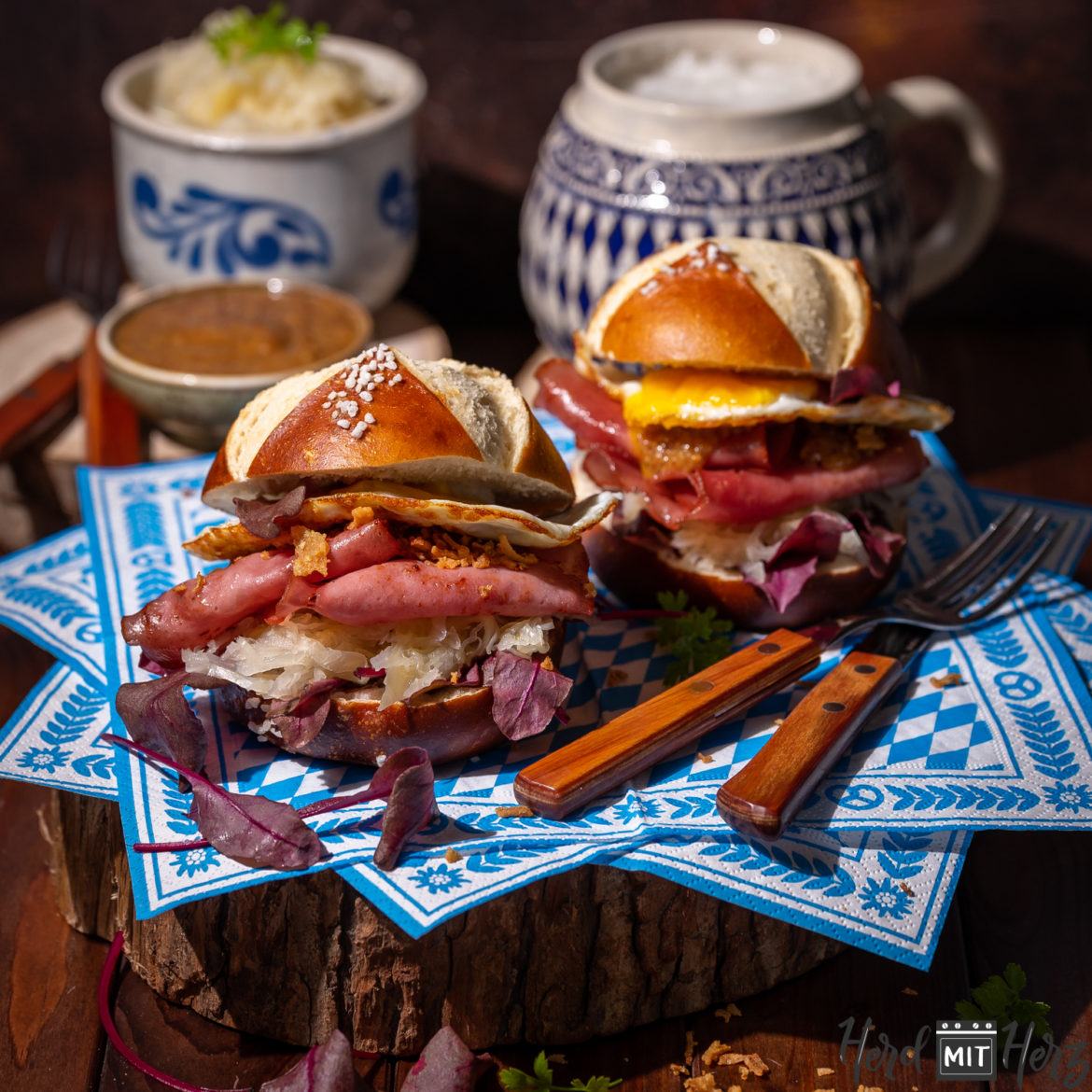 Für den Pattie habe ich natürlich Leberkäs verwendet und diesen dünn geschnitten und angebraten. Dazu gibt es würzigen Sauerkraut und ein Spiegelei sowie den obligatorischen süßen Senf. Alles wird klassisch in einen Laugen Bun gegeben.