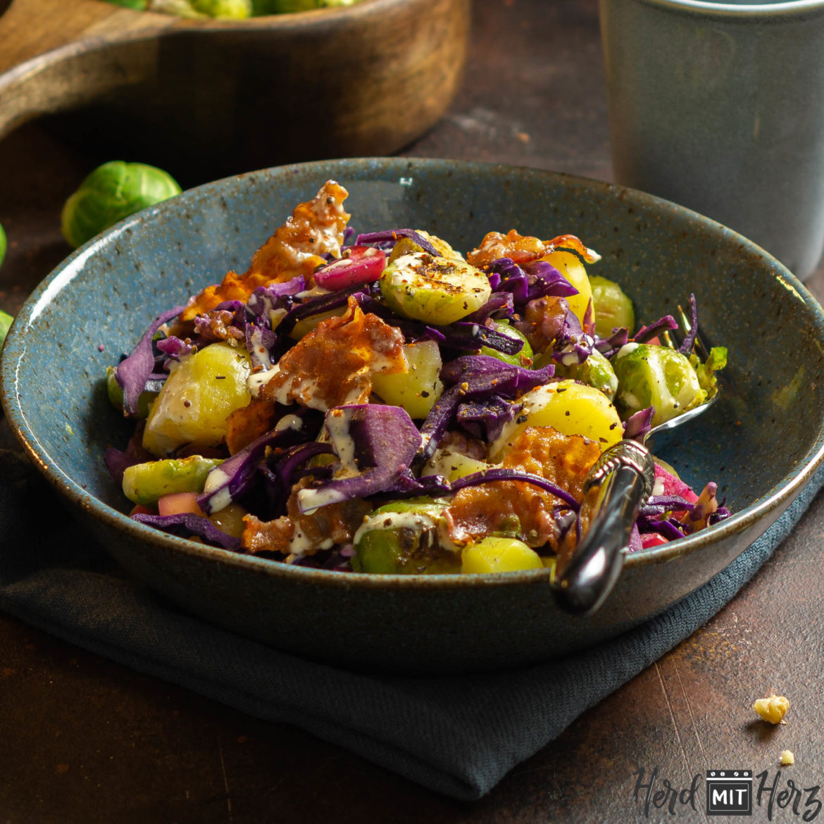 Ein Dressing aus den oben genannten Zutaten herstellen und abschmecken. Die Kartoffeln in kaltem Wasser mit etwas Meersalz und einem Lorbeerblatt aufsetzen und ca. 20-25 Minuten köcheln lassen. Danach das Wasser abgießen und die Pellkartoffeln ausdampfen lassen. In der Zeit den Rosenkohl putzen, die äußeren Blätter bei Bedarf entfernen und den Strunk kreuzweise einschneiden. Einen Teil auch direkt halbieren. Den Rosenkohl dann in heißer Butter anbraten, Fond oder Brühe angießen und alles mit Deckel ca. 10 Minuten köcheln lassen. Den Bacon in einer Pfanne anbraten, wenden, bis er knusprig ist, herausnehmen, auf einem Küchenpapier abtropfen lassen. Den Rotkohl in feine Streifen schneiden und ca. 30 Minuten mit etwas Salz ziehen lassen. Den Apfel entkernen, in kleine Stücke schneiden und mit etwas Zitrone beträufeln. Die Walnusskerne und die Apfelstücke in Butter und Honig karamellisieren lassen, den Rotkohl dazu geben, kurz anbraten, etwas von der Rosenkohl Brühe dazu geben sowie Sternanis und Zimt und alles ca. 10 Minuten dünsten. In der Zeit die Kartoffeln pellen und in kleine, mundgerechte Stücke schneiden. Alles zusammen in einer Schüssel anrichten und mit dem Dressing nappieren.